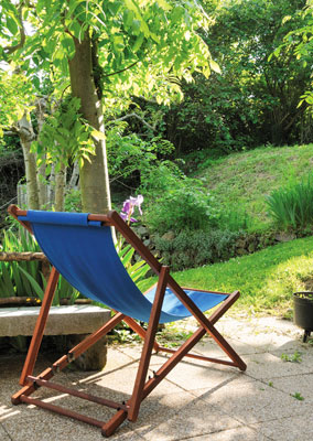 Sie tauchen in einen tiefen Frieden ein: Farne und Blüten setzen Akzente. Ein samtig weicher Boden lädt Sie zum Barfußgang ein. Licht bricht durch die Blätter eines Baumes, unter ihm erwartet ein kleiner Holztisch Ihren Besuch.